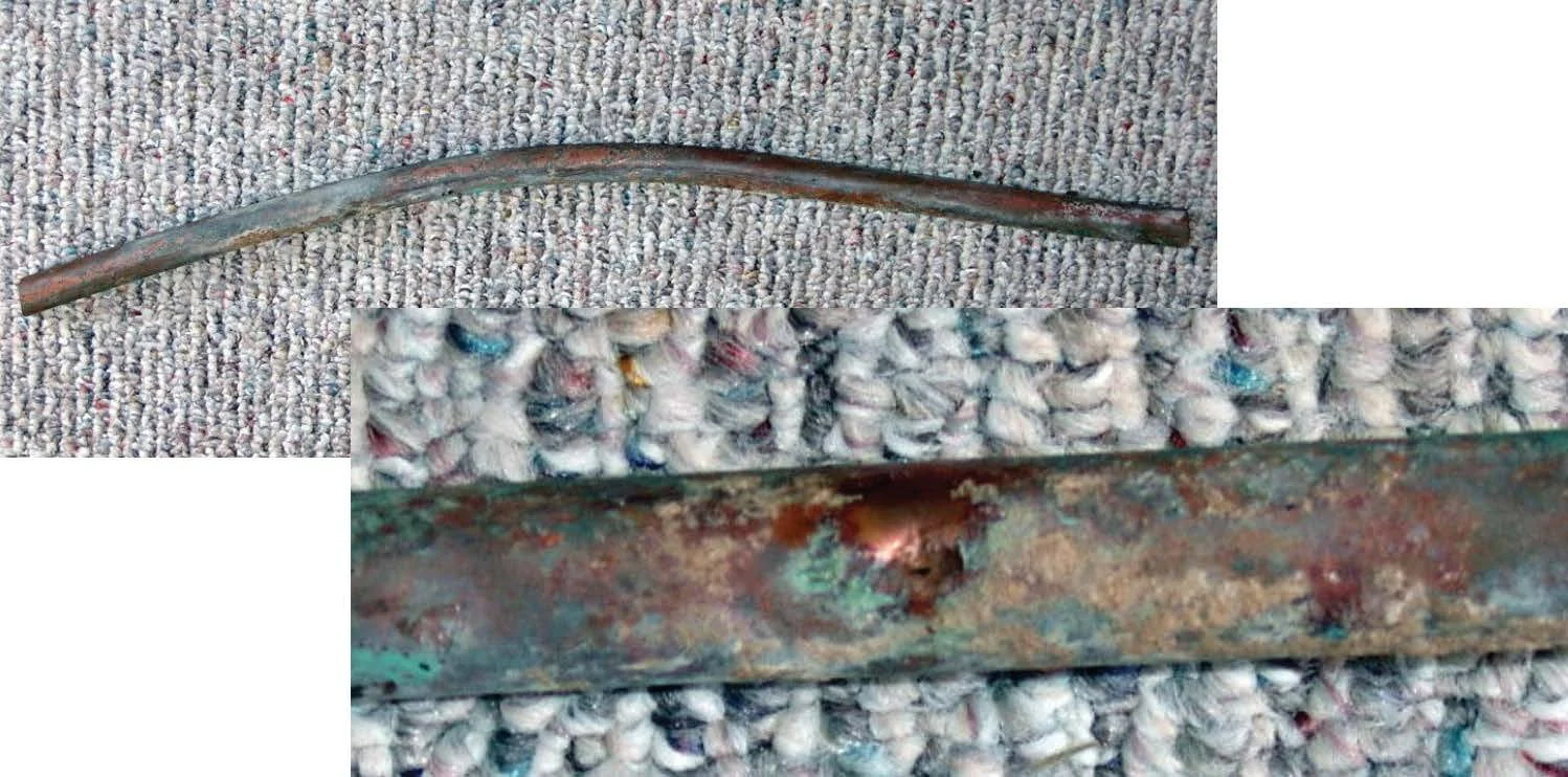 So they brought back the ultrasound equipment, traced the “pssssssssssst” to the living room, pulled up carpet, jackhammered again. And yet again when they reached the pipe, it was as dry as the day it was installed. An evening and a morning; the second day. Next, they followed the trail into the master bedroom--carpet torn up; jackhammer; dust. And there it was… The hot water line with the tiniest of pinholes. I have kept the pipe as a memento. The photo evidence is shown here.